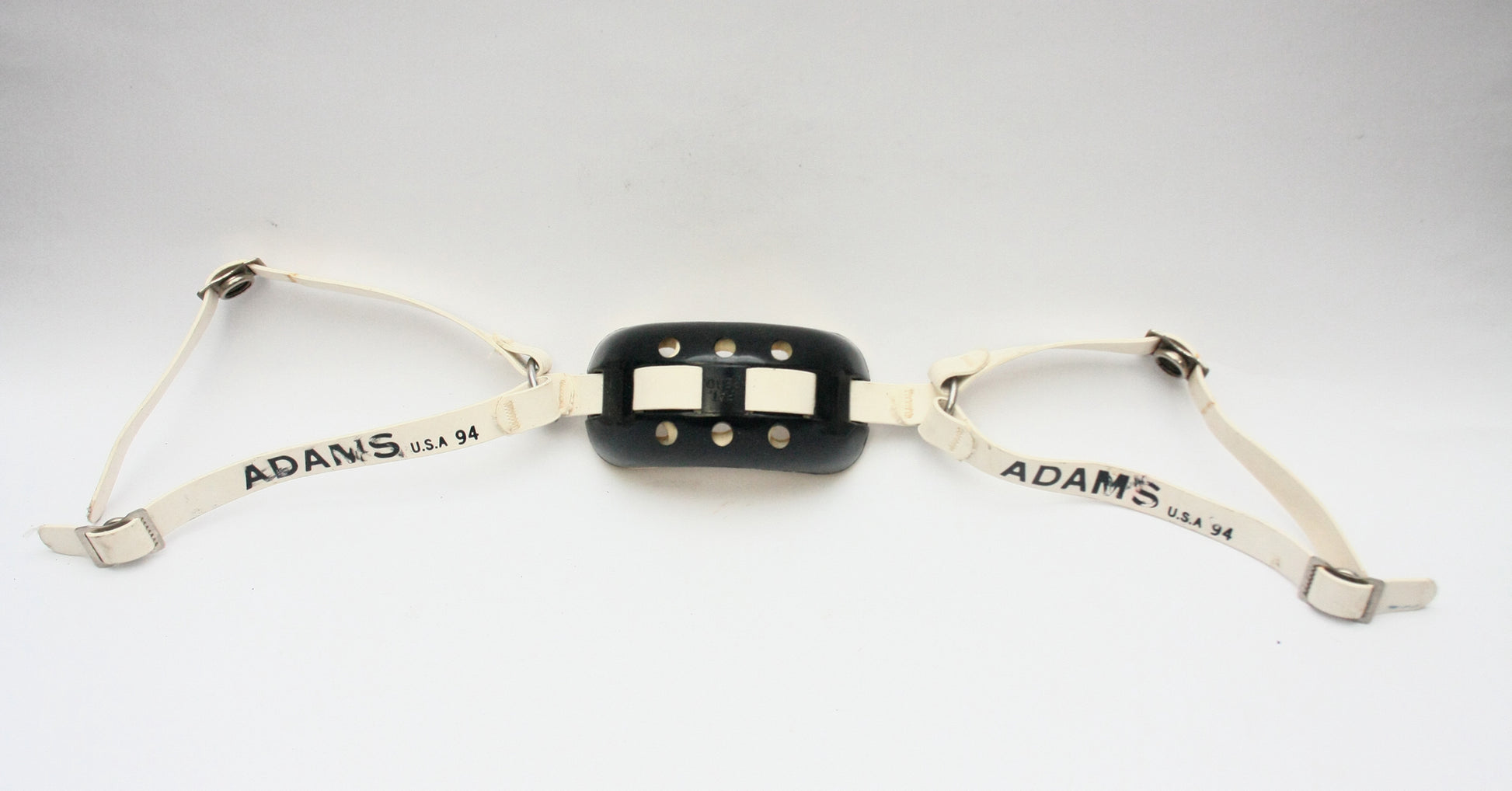 Vintage 1994 Game Used ADAMS Pro 100 High Hook Hard Cup Football Helmet Chinstrap. Black cup, white straps. Very good condition.